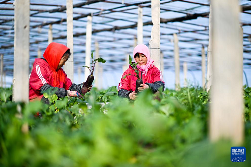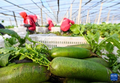 11月20日,在天津市西青区辛口镇种植沙窝萝卜的大棚内,农民在采摘萝卜。(新华社记者 赵子硕 摄)