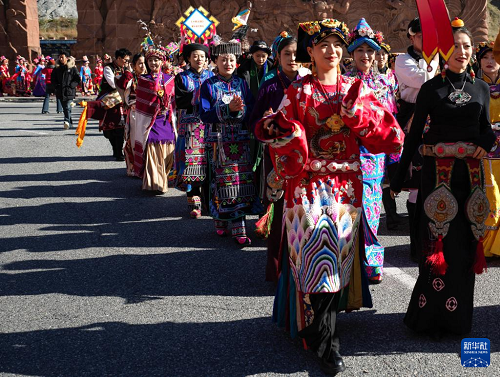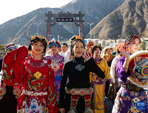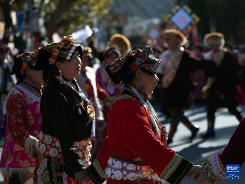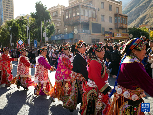 11月19日,在四川省汶川县城,身着民族服饰的妇女参加非遗大巡游活动。(新华社发 兰红光 摄)