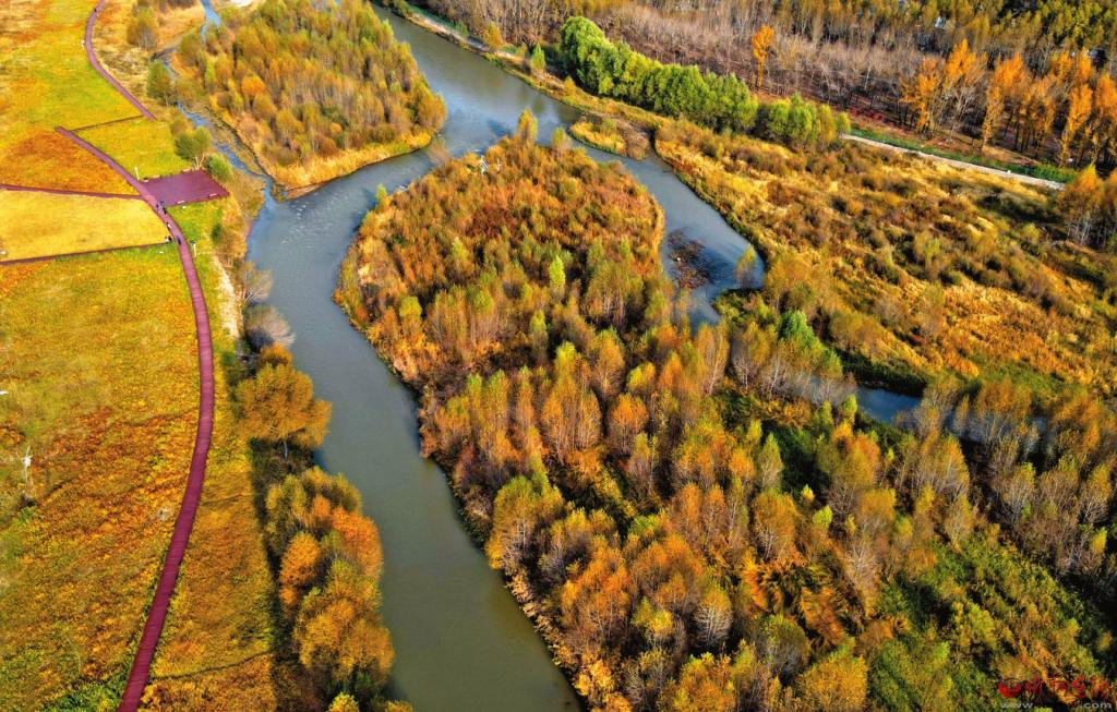 图为湿地公园内,汾河河道蜿蜒曲折,水面清澈明净,景致秀丽。