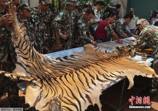 资料图:当地时间6月2日,据外媒报道,泰国野生动物保护机构又在涉事寺庙中发现了虎皮和大批用老虎尸体制作的护身符。