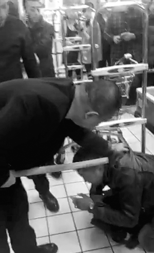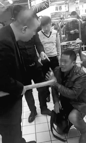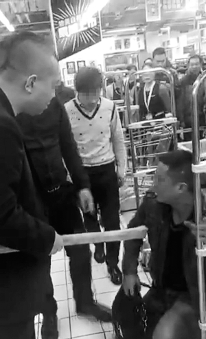 昨天,一段视频在网上被热议。“再不松开把你腿削折了”,一棕色外套男子被逼跪在地上,抱着收银台附近的栏杆连连承诺“再不来了”。另外两个大汉在旁拖拽他,其中一人用木棒打向男子,另一人在旁边踢了该男子一脚,并威胁道:“再来让你没命”(如图)。