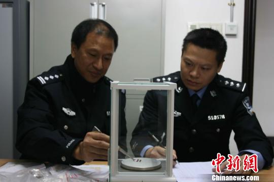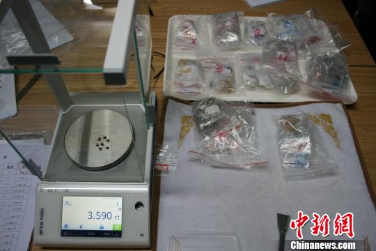 海关缉私警察正在给查获的宝石称重 关悦 摄
