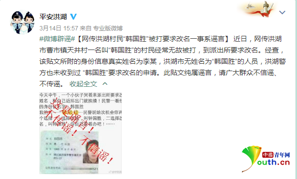 3月14日下午,湖北省洪湖市公安局官方微博@平安洪湖 发布微博辟谣称,网传洪湖村民"韩国胜"被打要求改名一事系谣言。