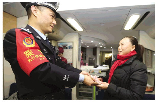 图为武汉铁路公安局武汉公安处乘务二大队乘警魏国强(左)将找到的遗失钱财交给失主。赵军 摄