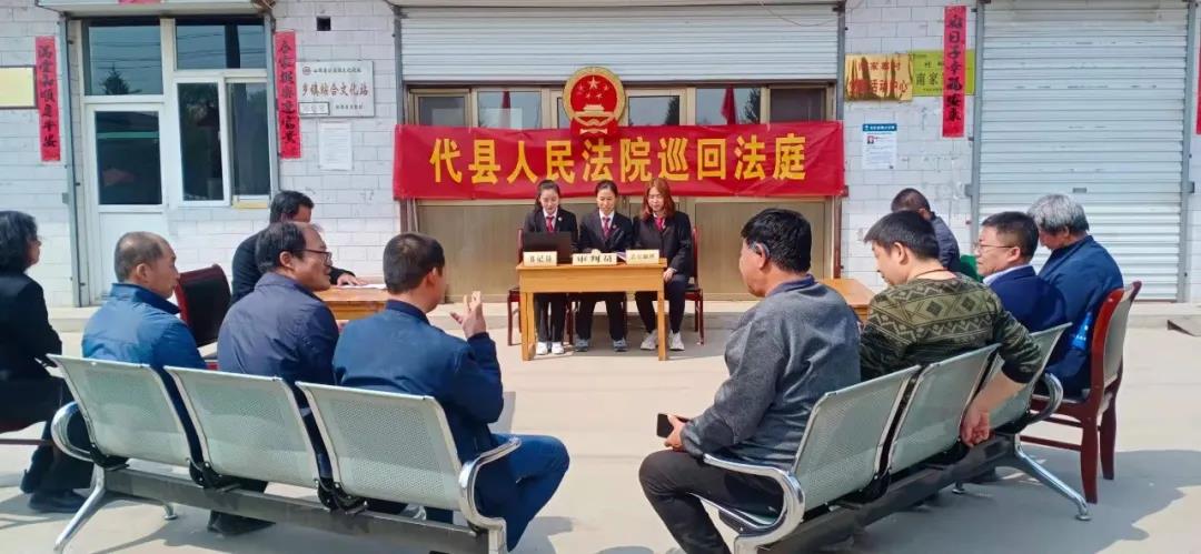 “现在开庭!”代县磨坊乡南家寨村村委会前,巡回法庭正在庭审,通过调解解决矛盾纠纷的同时,还给群众上了一堂生动的法治教育公开课。