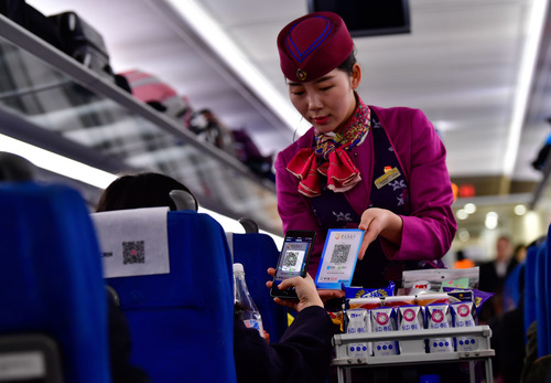 图为在重庆客运段G8516次列车上,一名旅客在使用手机扫码支付购买饮用水。新华社记者 刘潺 摄
