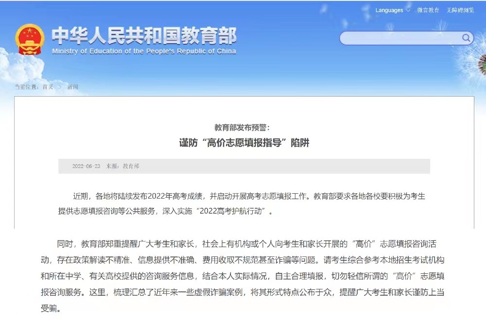 近日,教育部发布预警,提醒考生谨防“高价志愿填报指导”陷阱。有网站虚假宣传拥有所谓“内部信息”,自称掌握内部大数据,能够“精准定位院校”等等。事实上,每年高考填报志愿前,各省级招生考试机构都会发布当年高考成绩统计情况和近年来各高校录取分数情况,并不存在市面上的咨询机构或个人声称的“内部信息”。还有一些咨询机构假冒所谓志愿填报专家身份。该咨询机构打出广告,称团队的专家“获得高考志愿规划师认证”“来自著名高校”等。事实上,有关部门从未发放过“高考志愿规划师”这类职业资格证书。该机构一些所谓“志愿规划师”都是临时招募的社会人员,按照总部提供的“台词”给考生和家长辅导。家长购买这些机构的服务不仅花了冤枉钱,而且可能报错志愿。