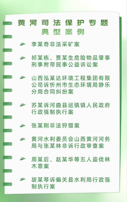 在3月9日“保护母亲河日”之际,为深入贯彻党的二十大精神,深入践行习近平生态文明思想和习近平法治思想,在法治轨道上服务保障黄河流域生态保护和高质量发展,忻州市中级人民法院现将八个黄河司法保护专题典型案例予以发布。这批案例涉及黄河及汾河环境资源审判刑事、民事、行政及公益诉讼等多个领域,集中体现了忻州市两级法院环境资源审判的鲜明特色和职能作用,全面展示了忻州法院以最严格制度最严密法治保护黄河生态环境的担当作为。