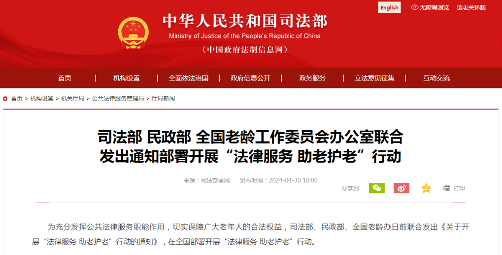 司法部、民政部、全国老龄办日前联合发出《关于开展“法律服务 助老护老”行动的通知》,在全国部署开展“法律服务 助老护老”行动。行动聚焦老年人群体公共法律服务需求,推出6个方面措施。