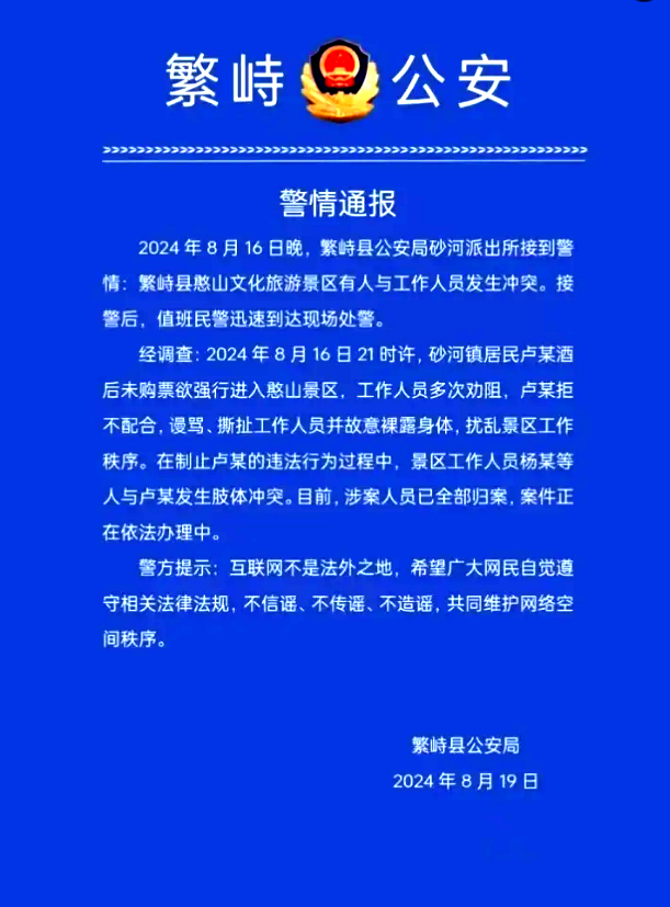 经调查:2024年8月16日21时许,砂河镇居民卢某酒后未购票欲强行进入憨山景区,工作人员多次劝阻,卢某拒不配合,谩骂、撕扯工作人员并故意裸露身体,扰乱景区工作秩序。在制止卢某的违法行为过程中,景区工作人员杨某等人与卢某发生肢体冲突。目前,涉案人员已全部归案,案件正在依法办理中。