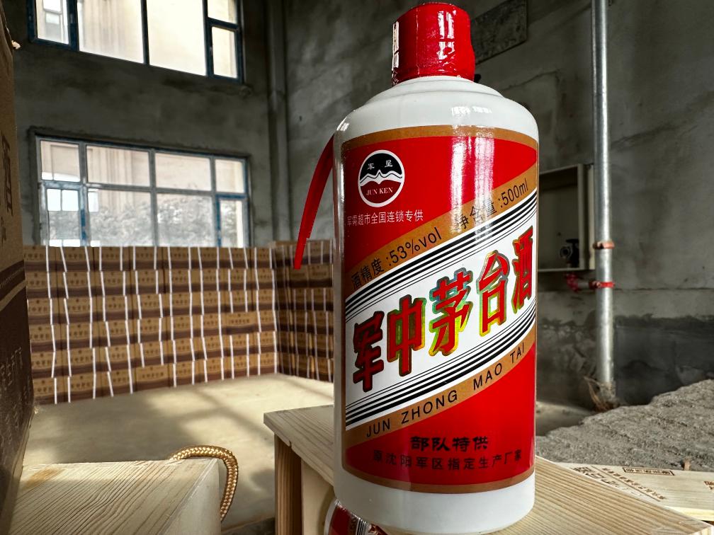 一架腾空而起的战斗机图案取代了飞天女神图案,包装盒上赫然印着“部队专用”字样……看起来颇像“茅台”的“特供酒”,实际上没一瓶是真的。