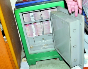 警方在东莞破获一宗地下钱庄案时,从一个保险箱中缴获满满一箱涉案现金。