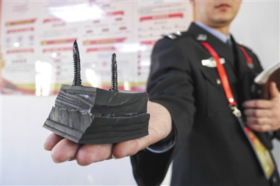 昨日,民警展示盗窃团伙用来扎汽车轮胎的作案工具“胶皮钉”。新京报记者 王嘉宁 摄