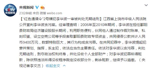 人民网北京1月23日电 据中央电视台新闻中心官方微博消息,江西省上饶市中级人民法院公开宣判李华波贪污案。