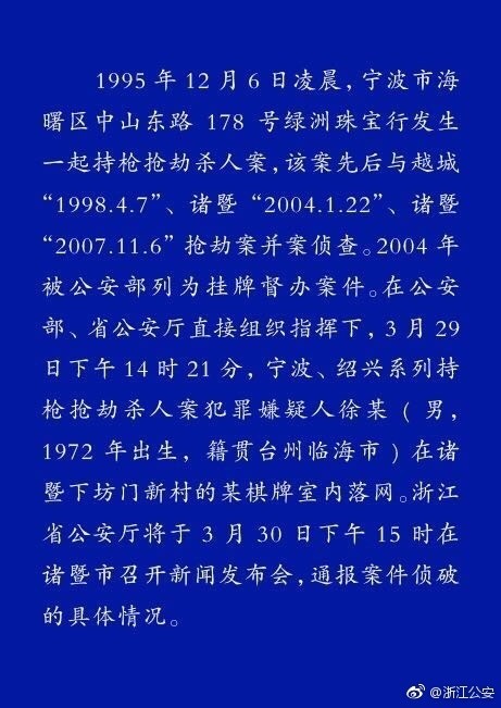 最新消息:浙江省公安厅将于3月30日下午15时在诸暨市召开新闻发布会,通报案件侦破的具体情况。