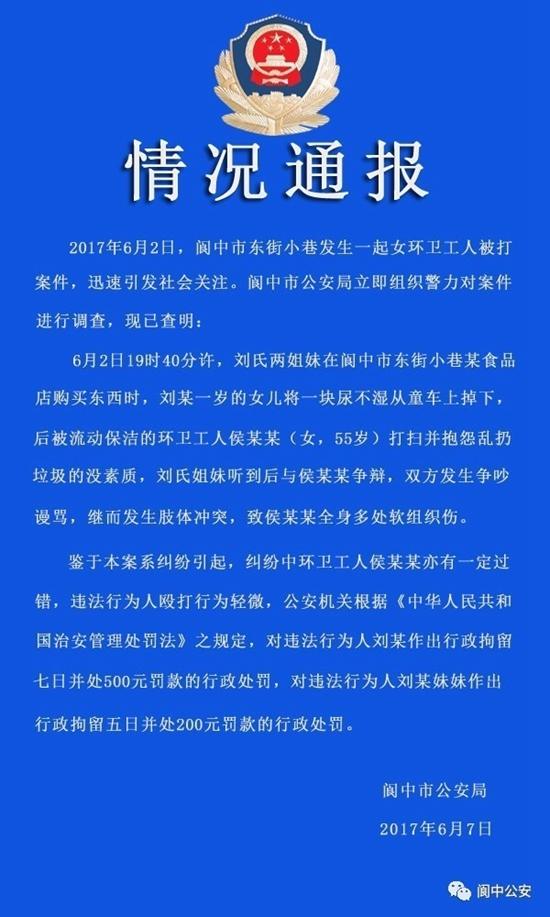 6月2日,阆中市东街小巷发生一起女环卫工人被打案件,迅速引发社会关注。阆中市公安局立即组织警力对案件进行调查,现已查明: