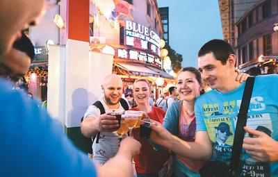 6月8日,来自乌克兰的游客在浙江宁波老外滩品尝美酒。新华社记者 翁忻旸摄