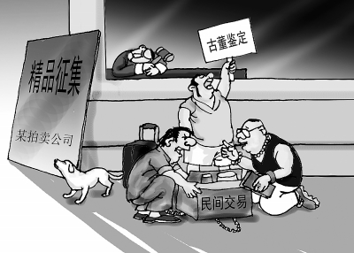中小拍卖行大批停业,大拍卖行又看不上他们的藏品,普通民间收藏者只好在马路边交易。漫画 王鹏