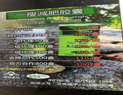 按照规定,一瘦减肥胶囊(微商俗称“小绿”)进货800盒及以上,才能成为官方合作商,进货价一盒100元。此外,进货500盒、300盒、100盒、50盒,分别成为金牌总代理、一级代理、二级代理、三级代理,进货价每盒对应分别为110元、130元、150元、170元。若代发货一盒,则为210元。