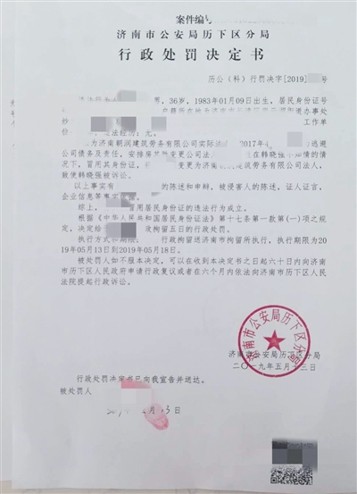 济南市公安局历下区分局出具的行政处罚决定书显示,冒用韩晓强身份证者被行政拘留5日。