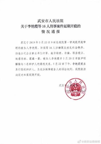 通报还称,原定于2019年5月23日9时在武安市人民法院第一审判庭开庭审理的被告人李艳霞、许琪等16人涉嫌聚众扰乱社会秩序伪造公司企业事业单位印章、敲诈勒索、诈骗、职务侵占、故意伤害、窝藏一案,被告人李艳霞于5月20日书面声明解除与二名辩护人的委托关系。5月 22日下午,李艳霞提出另行委托辩护人。为充分保障被告人的诉讼权利,武安市人民法院依法决定对本案延期开庭。