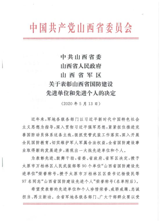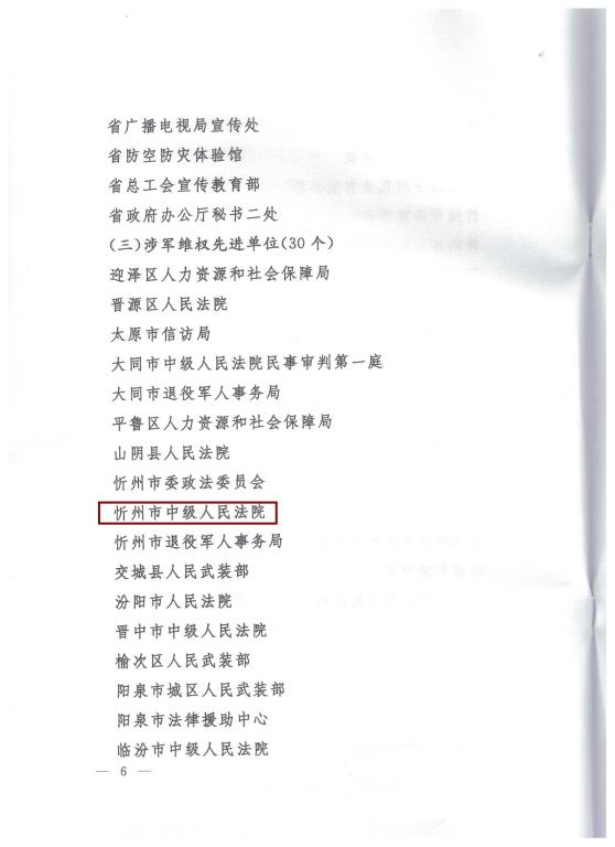 近日,中共山西省委、山西省人民政府、山西省军区下发了《关于表彰山西省国防建设先进单位和先进个人的决定》,忻州中院被授予“山西省国防建设涉军维权先进单位”荣誉称号。