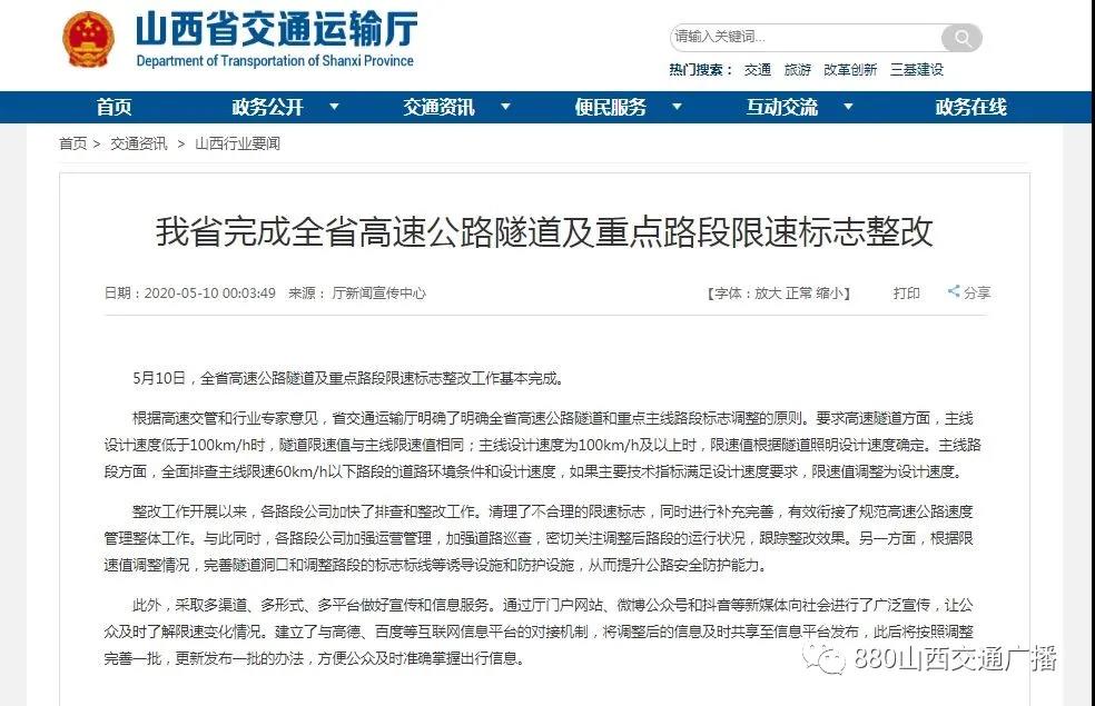 从山西省交通运输厅获悉,山西已于5月10日完成了全省高速公路隧道及重点路段限速标志整改工作,并将于今年8月1日前完成全省高速公路、一级国省干线公路限速标志的整改完善,其中要重点解决社会反映强烈的“断崖式”“隐蔽式”等不合理的限速问题。
