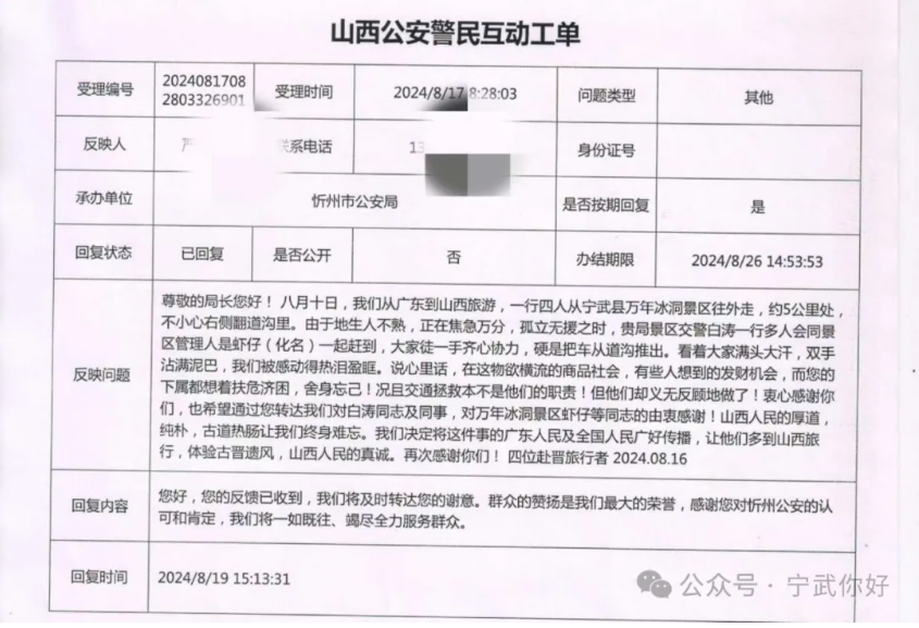 群众无小事,点滴映初心。8月19日,宁武县公安局收到忻州市公安局转来的山西公安警民互动工单,广东省的严先生在平台留言致谢:“8月10日,我们从广东到山西旅游,一行四人从宁武县万年冰洞景区往外走,不小心右侧翻到沟里。由于人生地不熟,正在焦急万分,孤立无援之时,贵局景区民警白涛一行多人会同景区管理人员一起赶到,大家齐心协力,硬是把车从道沟推出.....山西人民的厚道淳朴、古道热肠让我们终身难忘,我们决定将这件事向广东人民及全国人民友好传播,让他们多到山西旅行,体验古晋遗风,山西人民的真诚。再次感谢你们!”