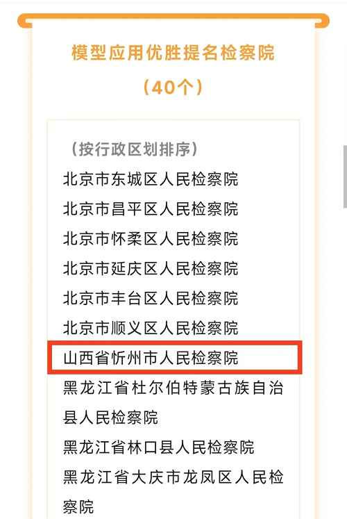 1月8日,最高检组织的2024年全国检察机关大数据法律监督模型推广活动评选结果出炉:忻州市人民检察院在模型应用活动中进入全国前50名,获评全国“模型应用优胜提名检察院”。