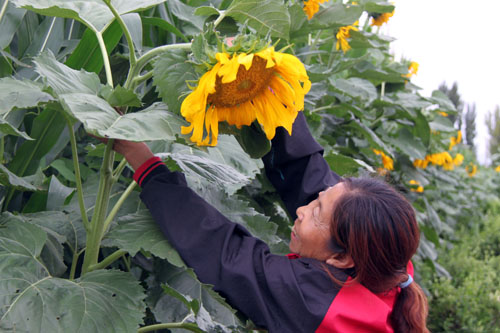 7月20日,原平市解放街农民刘丽平正在长势喜人葵花地里打支扣进行管理。该市积极引导农民大力发展油料经济农业种植,因地制宜、多措并举,促使农业增产农民增收。(赵春晓 摄)