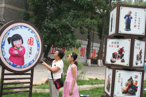 7月18日,原平市的家长正在忠孝园图文并茂的宣传图画前给孩子讲解。该市通过多种形式的方法宣传忠孝文化,让市民们更加了解其传统孝文化的内涵和传统美德,代代相传,焕发起人们更加热爱祖国和热爱人民。(赵春晓 摄)
