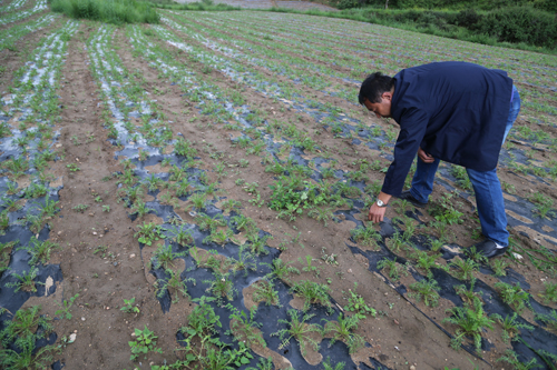 7月21日,静乐县堂尔上乡吕吕沟村佛光合作社村民解晋才正在察看玛咖长势。近年来,静乐县积极引导农民根据市场需求发展特色农产品种植,先后引进了藜麦、玛咖、黑枸杞等特色农产品,目前全县种植38000余亩,形成了种植、采收、加工、销售为一体的产业链,带动农民增收致富。(闫晓梅 摄)