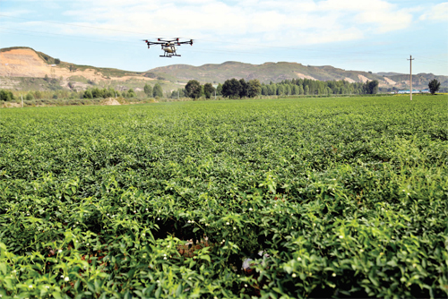 9月11日,在静乐县永仓种植专业合作社辣椒种植示范园,操作人员正在遥控无人机喷洒农药。据了解,无人机喷洒农药具有速度快、效率高等特点,1架无人机平均每天喷洒面积可达1000亩。(闫晓梅 摄)