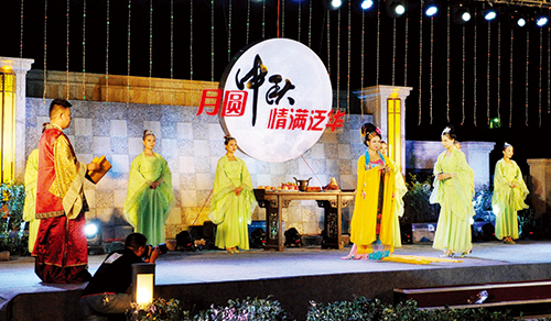 赏月、喝红酒、吃月饼,除了这些,本次中秋晚会还有一大亮点就是舞会。“南京路上的川流不息,石库门里的悲欢离合,十里洋场,浮光掠影,月色倾城,繁华如梦。”《夜上海》的歌声、穿着旗袍的端庄女子、报童的叫卖声……音乐剧《上海滩记忆》一开场就仿佛穿越时空,带着观众来到了老上海的繁华之地,时尚、气派又有腔调。音乐一转,伴随着激昂奔放的舞曲,几名舞者热情动感的表演将现场气氛推向了高潮。台下的观众也坐不住了,在主持人的邀请下,大家纷纷离座,走进舞池随着音乐跳起舞来。