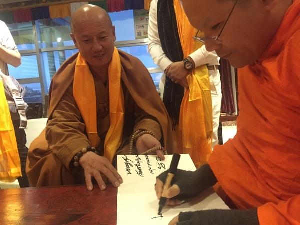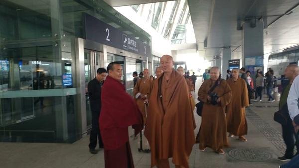 图为五台山望海寺住持释觉一法师与弟子们顺利到达西宁机场,木兰加措法师前往迎接。