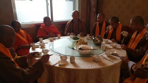 图为五台山望海寺住持释觉一法师与泰国僧人共进午餐。