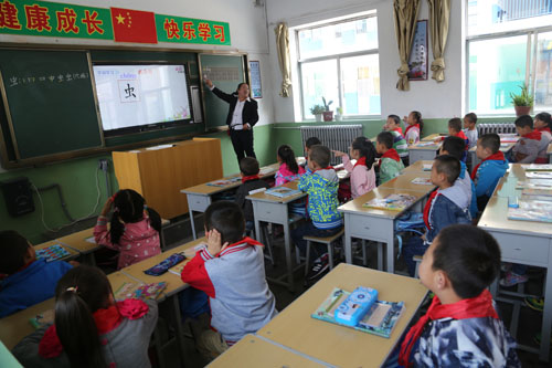 近日,在静乐县爱乐希望小学,学生正通过交互式多媒体教学方法上课。老师高兴地说:“有了多媒体真方便,以前讲一个例题要花几分钟抄写在黑板上,现在只需几秒钟就显示在频幕上,既节省时间又提高课堂效率。”近年来,该县加大教育投资力度,改善办学条件,为学生上课提供便利。(闫晓梅 摄)