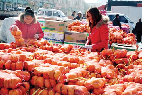 11月11日,原平市农贸市场上红红火火,这是市民们正在挑选金黄色柿子。该市合理化布局建市场,使农副产品有了好的销售平台,既方便市民购买又促进农民增收