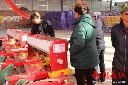 11月17日,来自原平市西镇乡的几位农民在聚农丰测土配肥中心选择新型“双胞胎”播种机,该机采用一穴双株,宽窄行种植,亩留苗可比传统播种机每亩增加上千株,增产20%以上,成为今后农民的首选播种机。(曹申义 摄)