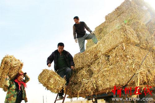 11月19日,定襄县宏道镇,大型秸秆打捆机正在无畏庄村农田里进行秸秆打捆,两台农运车运输,每捆4元销售给河边10万千瓦风电场,既得利益又环保又防火灾,一举三得。据了解,宏道镇该台打捆机是河边10万千瓦风电场无偿提供的,与本镇大型拖拉机配套,实施秸秆打捆1个多月,已经将1000多亩农田的秸秆打捆,让农民的废秸秆也赚钱,实现了防火、环保、秸秆再利用。图为工作人员将捆好的秸秆装车。(吉建平 摄)