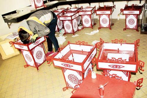 12月5日,原平市天牙山景区工作人员正在安装新灯笼。此次天牙山景区将更换100 个已经破损和陈旧的灯笼