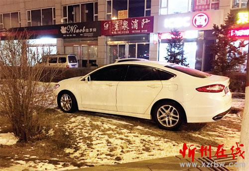 12月15日,记者途经市区团结西街和建设北路交叉路口,在东南角看到一辆白色轿车停在路边的绿化带上,碾压草地,让人心疼。