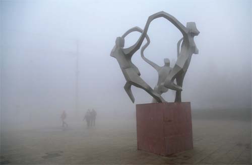 2017年1月3日,江苏连云港赣榆区市民在大雾中出行。