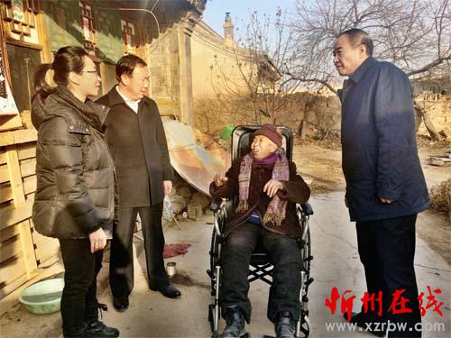 1月4日,山西省人防办组织干部职工开展送温暖、献爱心活动。当日,省人防办工作人员携带着38名干部职工捐款购买的大米、白面走进定点帮扶的繁峙县光裕堡乡光裕堡、华岩、大木瓜、小李牛四个贫困村,走访慰问了630户贫困户,为他们送上慰问品和“爱心轮椅”,让他们感受到了冬日的温暖。图为67岁的居大妈高兴地试用爱心人士刚送到的新轮椅。(本报记者 李春平 摄)