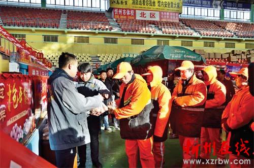 1月19日上午,山西熊夺宝网络科技有限公司面向忻州市环卫系统开展“献爱心迎佳节”活动,来自忻州市市容环境卫生管理处的50名环卫工人代表,每人领到了一份新鲜鸡蛋。现场的一位工作人员告诉记者:“环卫工人们为了城市的干净整洁付出了辛勤的汗水,希望这些鸡蛋能为他们补补身体。除现场领取鸡蛋的50名环卫工人之外,我市另外的1000多名环卫工人也将陆续领到爱心鸡蛋。”领到鸡蛋的环卫工李大姐高兴地说:“今年过年鸡蛋也不用买了,实在是太好了!”(王菲 郭剑鸣 摄)