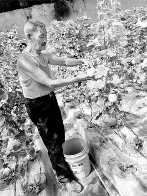 4月11日,忻府区部落村金山农业示范园区,68岁的村民冯永安在自己的大棚内采摘香瓜。七年前,他敢尝敢试开始种植大棚香瓜,每到这个香瓜上市的季节,他和老伴吃住在大棚,精心待弄这些宝贝疙瘩,光这一亩大棚香瓜,每年都可以给他带来十万元左右的收入。尤其是近两年,他自创科学方法,改良连种土壤,使香瓜的品质、产量都保持稳定势头,深受市场欢迎。他不仅带动本村村民共同致富,而且为慕名而来的同行热心传授技术,成为远近闻名的大棚香瓜种植专家。本报记者 聂艳英 摄