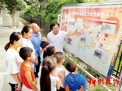 档案人董建平(中)向青少年义务宣讲爱国主义教育展览。