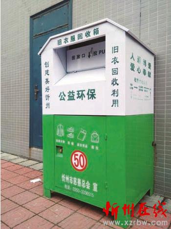 市慈善总会工作人员表示,下一步市慈善总会将与志愿者组织联合制作更多的旧衣服回收箱,投放覆盖忻州城区所有小区,使我市的慈善捐助工作机制逐步走向常态化。图为设置在惠民小区的旧衣物回收箱(鲁明强)