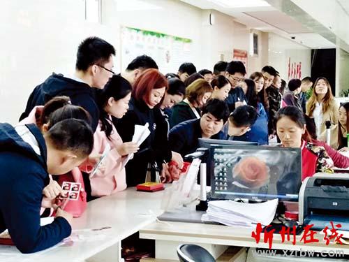 本报讯10月10日,寓意“十全十美、幸福快乐”,一大早,在城区慕山南路忻府区政务大厅前,就有好几对准新人等候在那里,准备领取结婚证。记者在现场看到,还有一对对准新人正陆续走进大厅。
