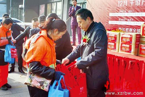 本报讯12月9日,我市环卫工人领到海尔专卖店赠送的冬季防寒用品。随着较强冷空气带来的降温,忻州城区气温急转直下。当天上午,忻州海尔专卖店为现场50余名环卫工人代表发放了“ 防寒礼包”,给冬日里工作在一线的“马路天使”们送来了一份温暖。同时,还将一个大蛋糕分送给环卫工人,为他们送上了特别的关怀。